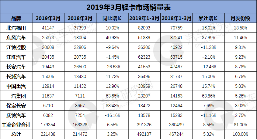 3月,商用车销售50.06万辆,环比增长90.98%,同比增长2.36%。 货车销售45.77万辆,环比增长88.61%,同比增长2.54%,其中3月轻卡卡市场销售22.14辆,同比增长3.25%, 2019年收获三连涨,2019年第一季度国内轻卡卡累计销售49.21辆,同比增长5.32%。