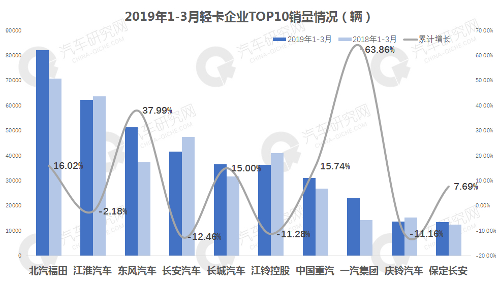 第一季度前十企业销量排名来看,北汽福田8.2万辆的成绩坐稳轻卡冠军宝座,江淮销售6.2万辆,位居亚军,东风汽车虽然增长势头强劲,但距离江淮还有1万辆的差距,一汽集团增幅最高达到63.86%,降幅最高的依然是长安汽车为12.46%。