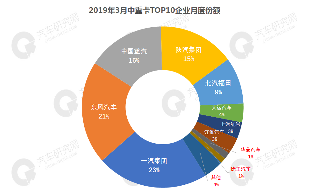 从市场份额来看,销量前十企业3月份合计份额达到96%,而排名前五的企业合计份额就达到80%,其中排名前两位一汽和东风两家家企业就占43%;排名3、4位的重汽和陕汽在3月份分别为15.51%和15.27%,探花之争十分激烈。