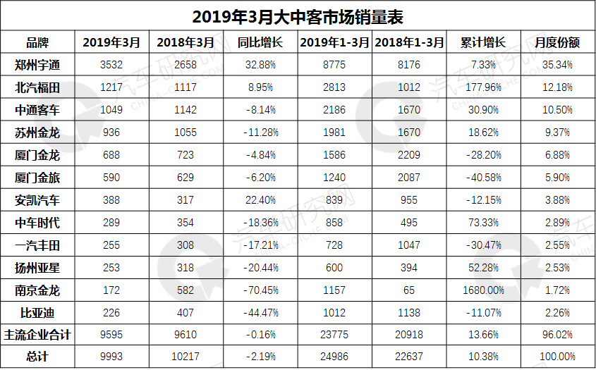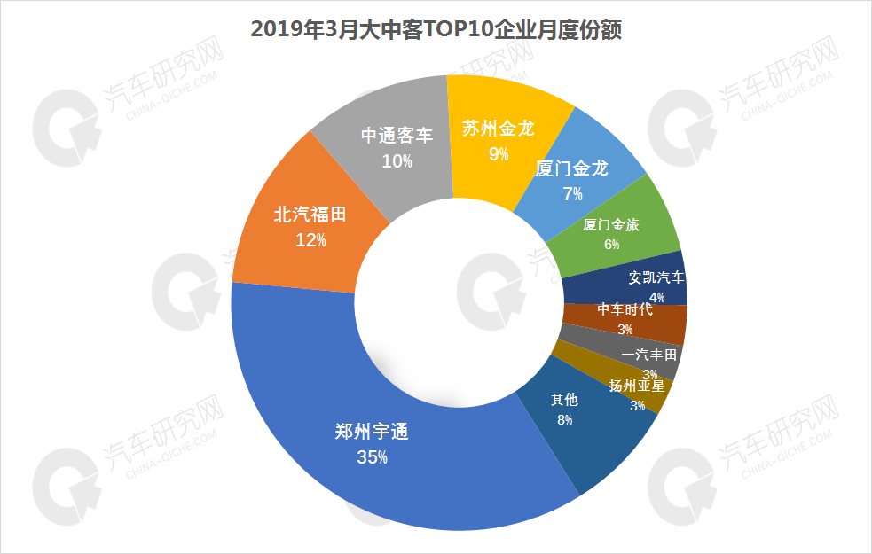 2019年3月大中客销量:宇通地位稳固 南京金龙暴增16倍