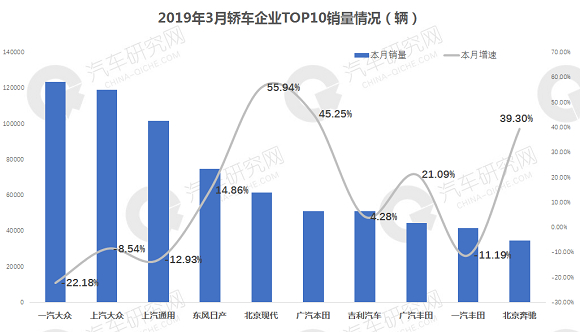 从乘用车前十企业销量来看:居前两位的企业依然是南北大众,销量均超15万辆,上汽大众同比出现下滑,一汽大众同比实现微增。上汽通用销量为14.04万辆位居第三,同比微增0.22%。东风本田增幅最高,同比为20.35%,位列第九;上汽通用五菱降幅最高为-39.30%。 [详细]