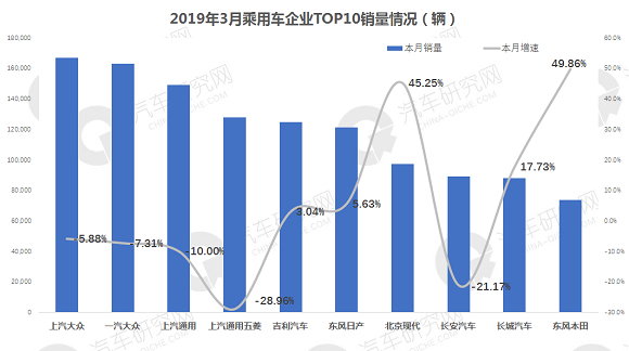 从乘用车前十企业销量来看,居前两位依然是南北大众,销量均超16万辆,同比小幅下滑,上汽通用以15万辆的成绩居第三;上汽通用五菱降幅最高为28.96%,北京现代表现良好,增幅超45%,位列第七,东风本田增幅最高近50%。