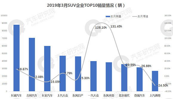 从SUV前十企业销量来看,长城汽车稳居首位,同比增长18.67%,二、三位是吉利和长安,同比下降2.08%和15.5%,增幅较高的是一汽大众和东风本田,同比增长近130%,上汽通用本月继续下滑,同比降低24.5%。
