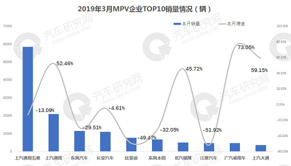 从MPV前十企业销量来看,上汽通用五菱一枝独秀,销量是排名第二位的上汽通用3倍,广汽乘用车本月表现良好,同比增长73.05%,增幅最高,江淮汽车降幅最高,超50%。