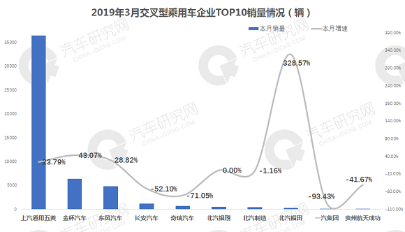 从交叉型乘用车前十企业销量来看,上汽通用五菱以3.6万辆的成绩遥遥领先,北汽福田增幅最高,为328.57%,排名跌至第八,降幅最高的企业是一汽集团,同比下降93.43%,北汽银翔首进前十。