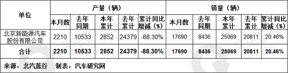 北汽新能源1-4月累计销量为30078辆 同比下滑2.50%