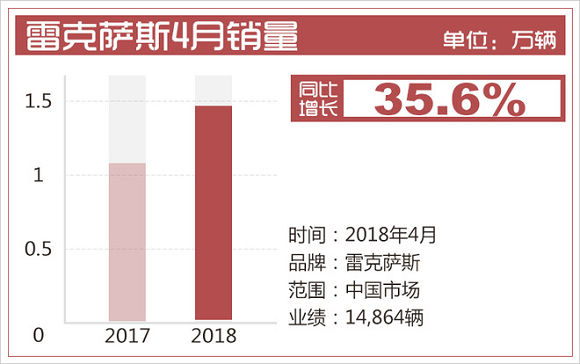 进入2018年后,雷克萨斯的市场表现一直处于上升通道,继3月在华销量达14,713辆,同比增长36.9%后,4月销量再次逼近1.5万辆大关。其中,智·混动车型单月销量为5,331台,占当月销量的35.9%。此外,雷克萨斯今年4月的整体销量和智·混动车型销量双双创下历史新高。