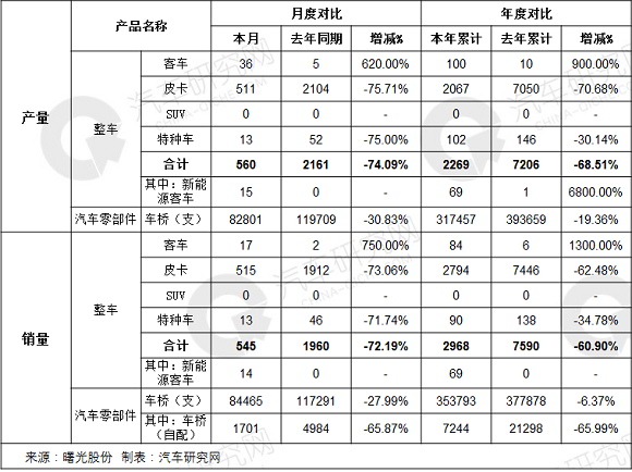1-4月累计整车产量合计2269辆,同比减少68.51%;销量合计2968辆,同比减少60.90%。汽车零部件车桥累计产量317457支,同比减少19.36%;累计销量353793支,同比增长6.37%。