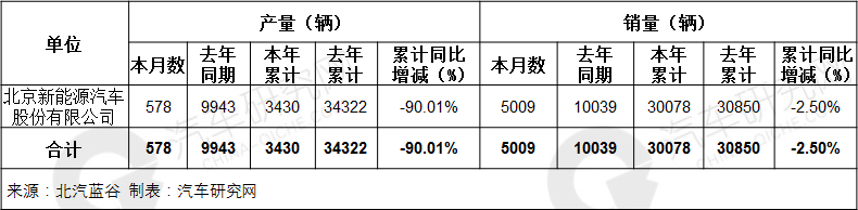5月8日,北汽蓝谷发布4月产销快报,2019年4月,其子公司北汽新能源产量为578辆,同比下滑94.19%,销量为5009辆,同比下滑50.10%;1-4月,北汽新能源累计产量3430辆,同比下滑90.01%。累计销量为30078辆,同比下滑2.50%。