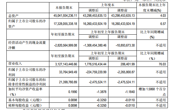 近日,北汽蓝谷发布了2019年第一季度报告,其中显示,公司第一季度营业收入约为31.27亿元,较上年同期增长76.03%;归属于上市公司股东净利润约为0.34亿元。