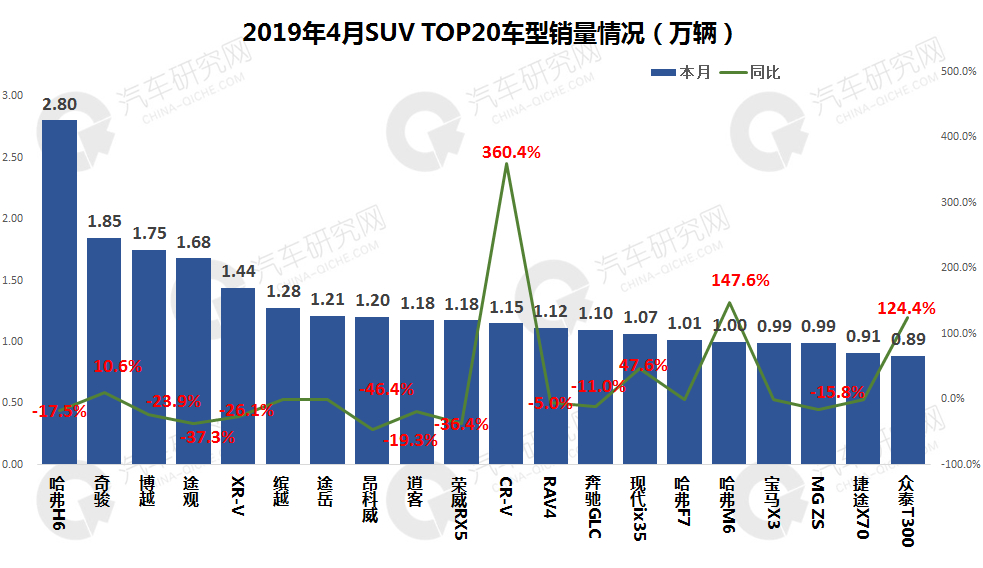 2019年4月SUV市场销量66.43万辆,同比下降18.6%,2019年1-4月SUV市场累计销售293.8万辆,同比下降15.6%。