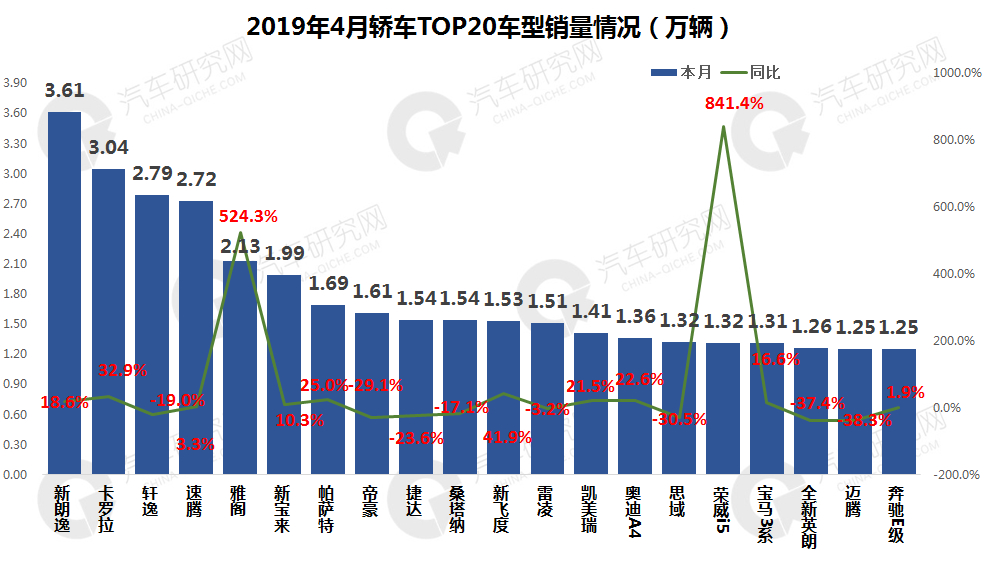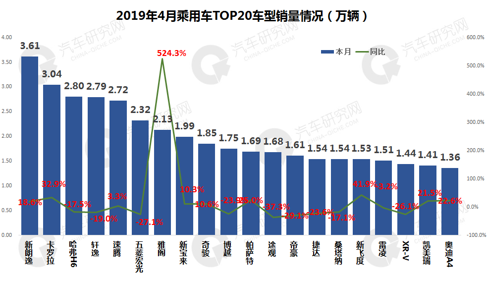 从整体TOP20车型来看,新朗逸4月销售3.61万辆,同比增长18.6%,位居首位,卡罗拉以3.04万辆超轩逸位列第二,同比增长32.9%,增长势头强劲,排名第三位的是轩逸,销量2.79万辆,同比下降19%,是前三车型中唯一下降的车型。