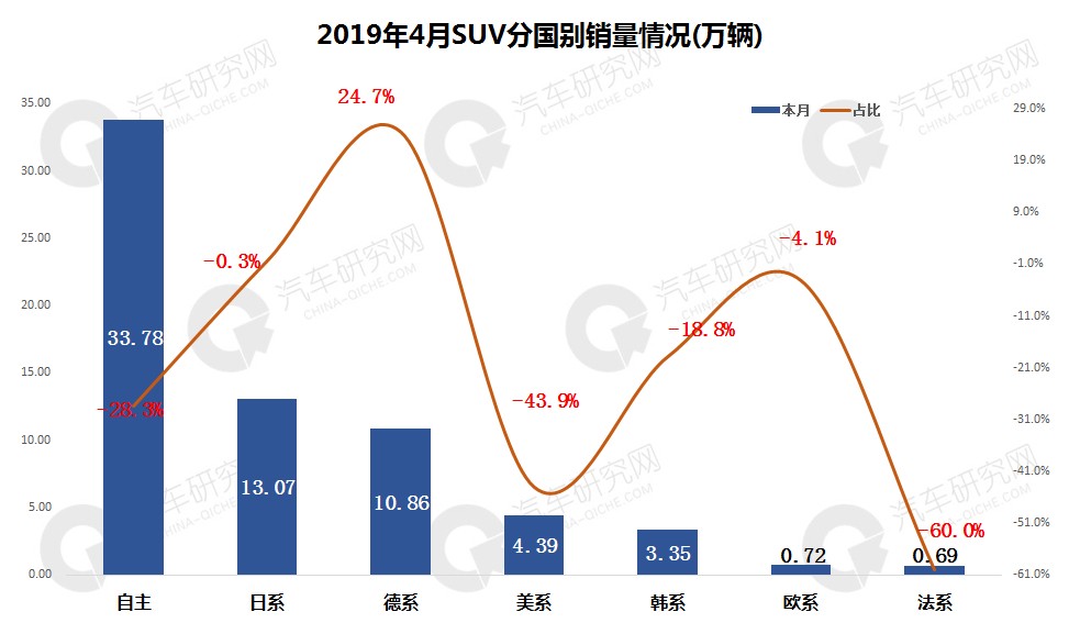 分国别来看,SUV市场德系是唯一增长的国别,德系车型的增长主要是因为途观带来的销量,本月销售1.68万辆。自主企业本月销售33.78万辆,同比降幅达28.3%,降幅最高是法系,降幅达60%。