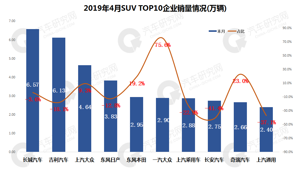 2019年4月SUV市场销量66.43万辆,同比下降18.6%,2019年1-4月SUV市场累计销售293.8万辆,同比下降15.6%。