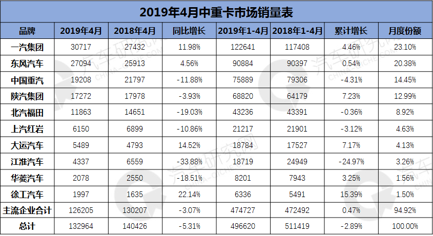 4月,商用车销售40.56万辆,同比增长0.13%,货车销量36.93万辆,销量增长0.99%。1-4月,货车销量138.31万辆,同比增长1.94%,其中中重卡累计销售13.3万辆,同比下降5.31%。