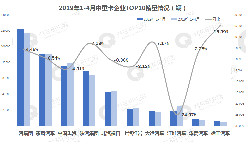4月中重卡前十企业排名:4增6降,与3月相比,前三甲依旧是解放、东风、重汽,江淮本月降幅最高超30%,徐工本月增速最高,为22.14%。