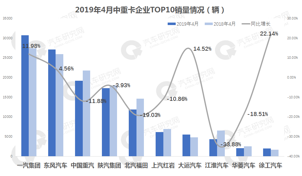 从累计前十企业销量排名来看,第一阵营排名与本月一致,一汽以12.3万辆的成绩遥遥领先,东风汽车紧随其后,销量超9万辆,实现小幅增长,重汽同比下降4.31%,是前三企业中唯一下降的企业。