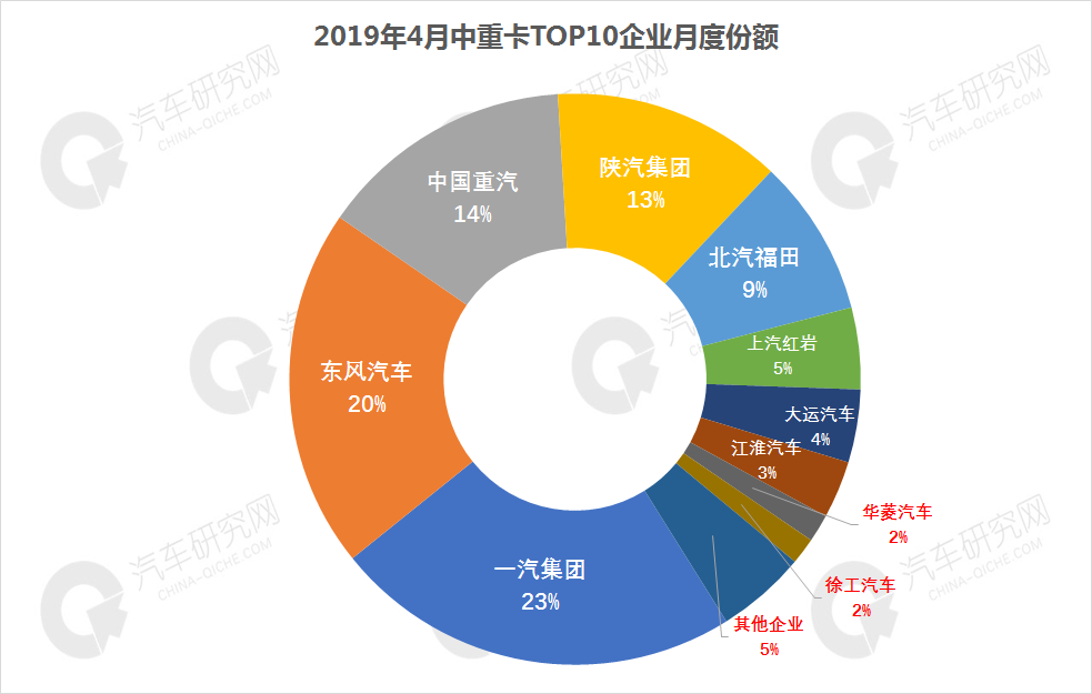 从市场份额来看,销量前十企业3月份合计份额达到96%,而排名前五的企业合计份额就达到80%,其中排名前两位一汽和东风两家家企业就占43%;排名3、4位的重汽和陕汽在3月份分食了15.51%和15.27%,探花之争十分激烈。