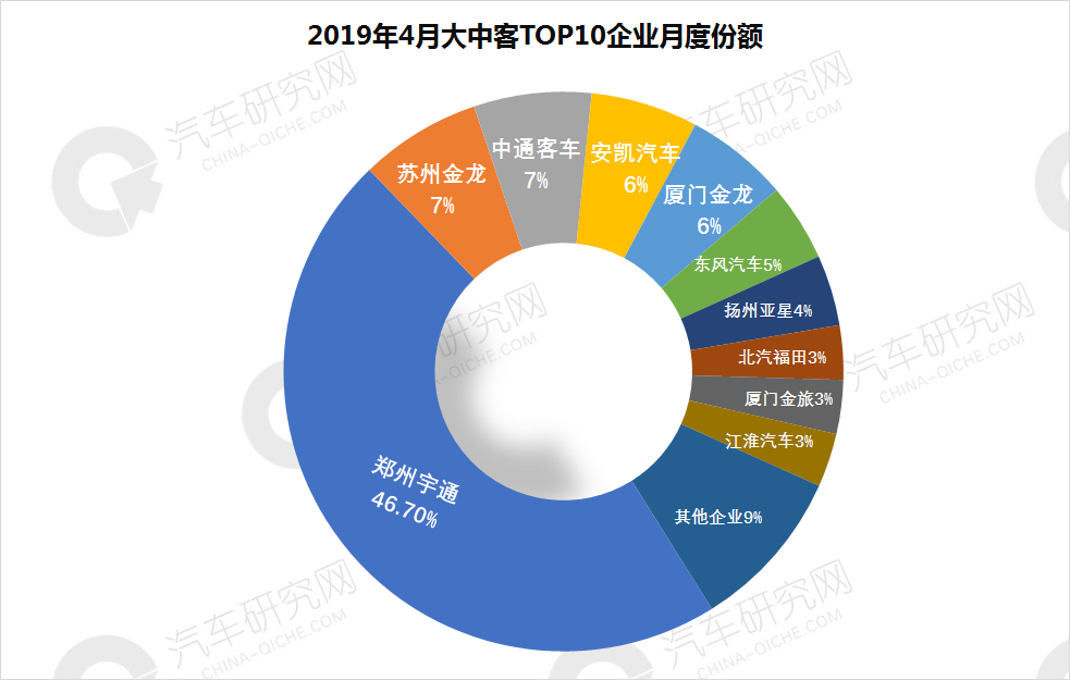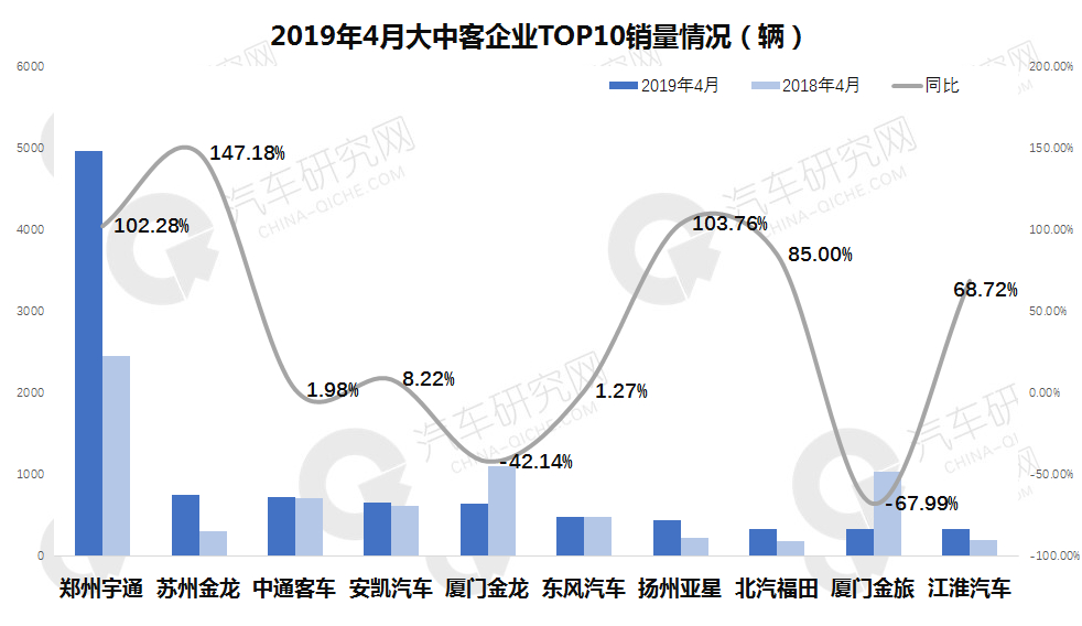 4月大中客前十企业排名:8增2降,郑州宇通销售4960辆,同比增长超102.28%,创本年新高,苏州金龙本月表现优异,以744辆的成绩摘得榜眼,同比大增147.18%,中通客车位居第三名,销售722辆,下降的企业是厦门金龙和厦门金旅,分别下滑42.14%和67.99%,北汽福田本月虽增长85%,但排名与上月相比下滑6位,位列第八名。