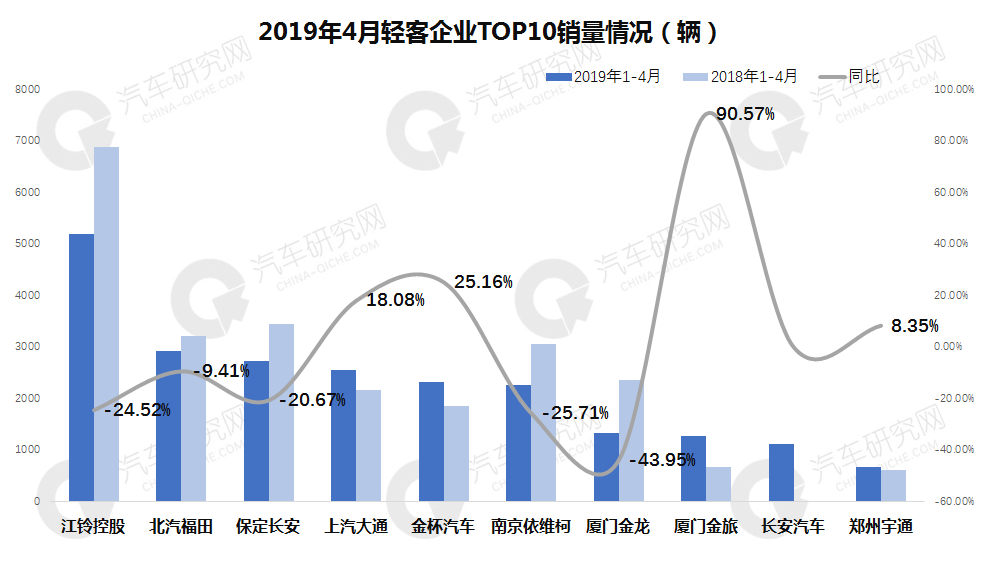 从4月轻客前十企业排名看:5增5降,江铃销售5193辆居首位,同比下降24.52%,位居二三位依然是北汽福田和保定长安,前三甲均呈下降趋势,金杯汽车销售2308辆,同比增长25.16%,排名上升至第五,厦门金龙同比降幅最高为43.95%,厦门金旅表现良好,同比实现超90%的增长。