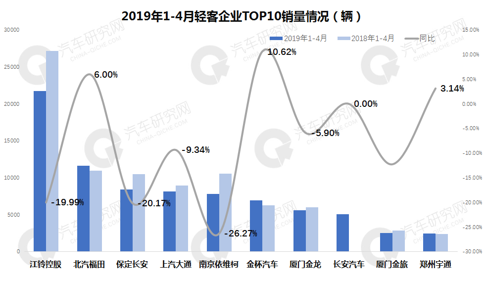 从前十企业累计销量排名来看,江铃控股以2.17万辆的成绩遥遥领先,北汽福田排名第二销量突破1.1万辆,保定长安销量8397辆,同比下降20.17%,19年首进前三,从累计增长看,仅有3家企业实现的正增长,其余均出现不同程度下滑,其中金杯汽车增幅最高达10.62%,南京依维柯下降最大为26.27%,排名第五。