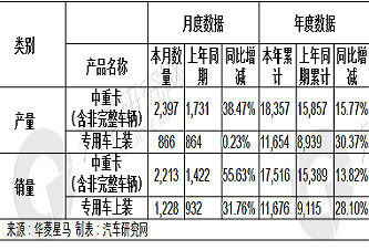 3月份,公司中重卡产量为2112辆,同比下降0.19%;销量为2582辆,同比增长5.86%。1-3月份,公司中重卡产量累计5418辆,同比增21.81%;销量累计5117辆,同比增21.28%。 [详细]