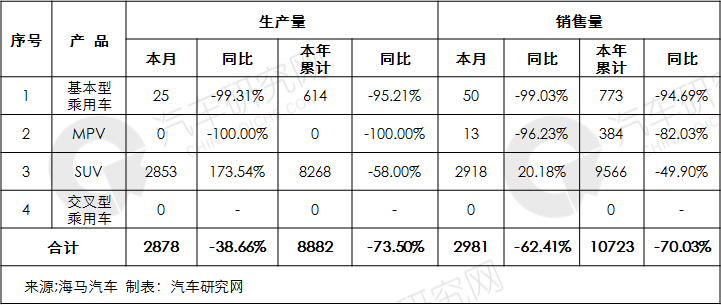 在具体车型方面,海马汽车1-5月基本型乘用车销量为773辆,同比下滑94.69%;MPV销量384辆,同比下滑82.03%;SUV销量9566辆,同比下滑49.90%,交叉型乘用车产销量为零。