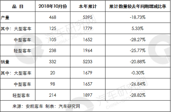 安凯客车1-10月产销双下滑,降幅均超18%