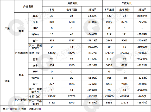 12月6日,曙光股份发布11月产销快报。数据显示,曙光股份11月生产整车553辆,同比下滑51.11%;1-11月产量总计5940辆,同比下滑59.79%。车桥1-11月产量下滑20.93%。11月整车销量为449辆,同比下滑65.57%;1-11月销量总计7240辆,同比下滑52.03%,车桥1-11月销量下滑62.51%。 [详细]