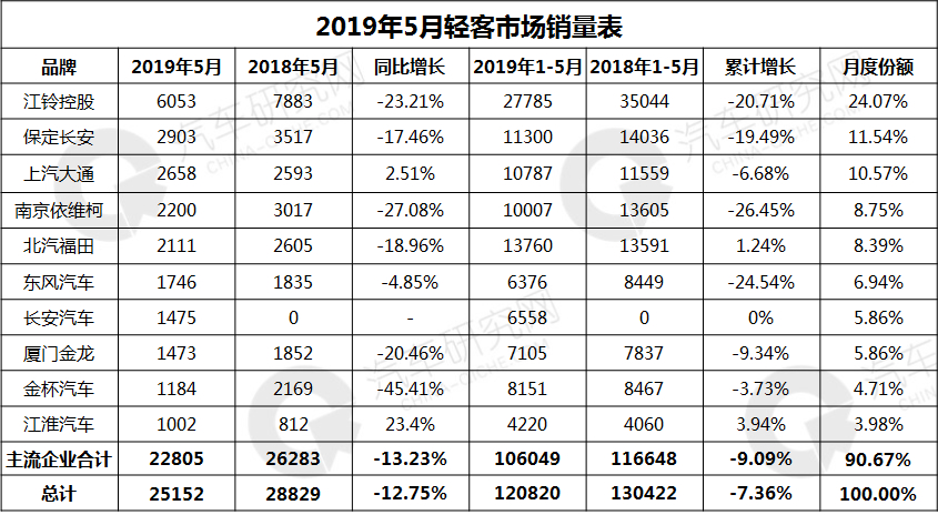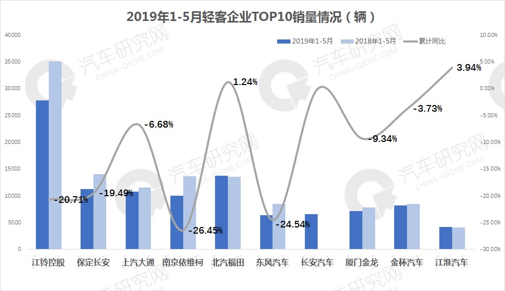 1-5月,客车累计销售16.77万辆,同比下滑8.77%,轻客累计销售12.08万辆,同比下滑7.36%。