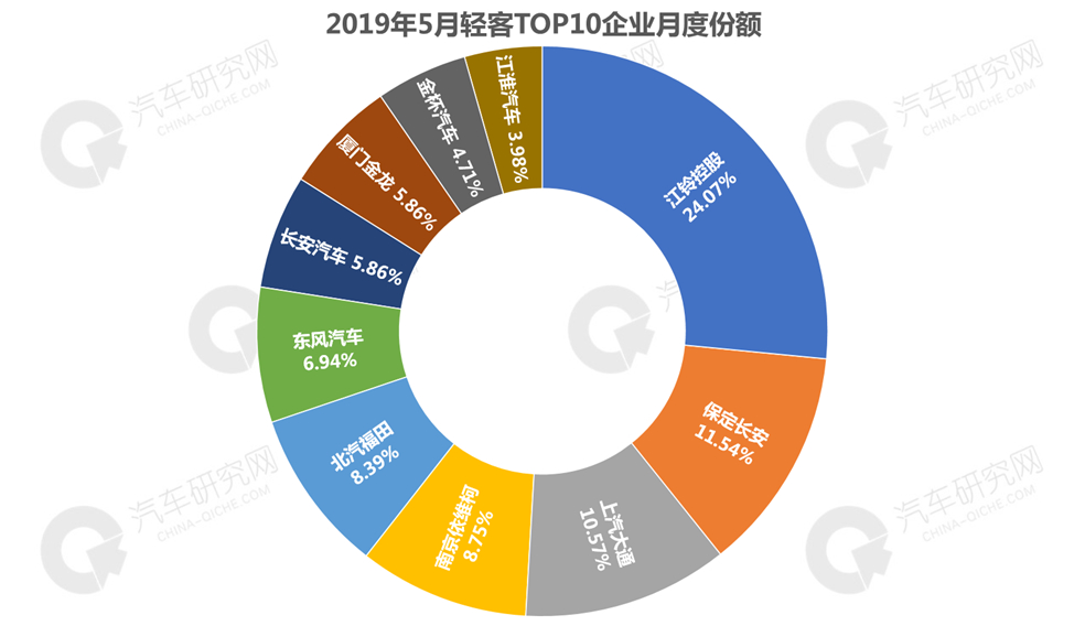 从市场份额来看,江铃控股占24.07%的份额,排名前十企业的市场份额达90.67%;整车销量前5的企业依次为江铃、保定长安、上汽大通、南京依维柯和北汽福田,5家合计销售1.59万辆,占轻型客车整车总销量2.52万辆的63.32%。