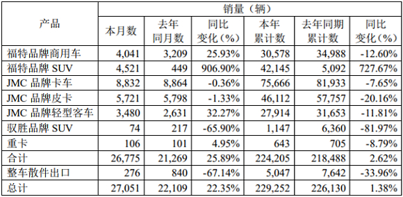 数据显示,2019年10月份,江铃销售福特品牌商用车4041辆,同比增长25.93%;1-10月份,江铃累计销售福特品牌商用车30578辆,同比下降12.60%。