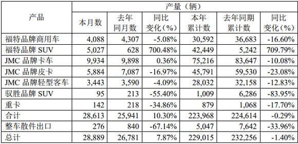 其2017年上市的自主品牌轻客产品——江铃特顺,2019年10月实现销售3480辆,同比增长32.27%;1-10月份,江铃特顺累计销售27914辆,同比下降11.81%。
