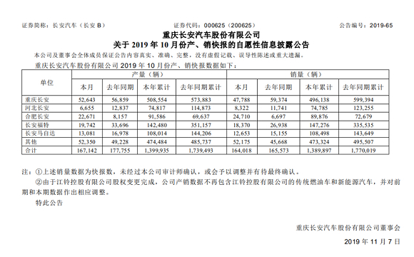 据最新发布数据显示,长安汽车10月产量为167,142辆,同比下降6%;1-10月累计产量1,399,935辆,同比下降19.5%。10月销量为164,018辆,同比微降0.9%。1-10月累计销量1,389,897辆,同比减少21.5%。