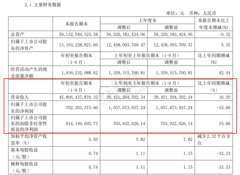 公告显示,均胜电子前三季度(1-9月)实现营业收入458.06亿元,同比增加16.2%,归属于上市公司股东的扣除非经常性损益的净利8.1亿元,同比增长15.7%,整体形势向好。但聚焦到第三季度(7-9月),无论是环比还是同比,营收都出现了不同程度下滑。