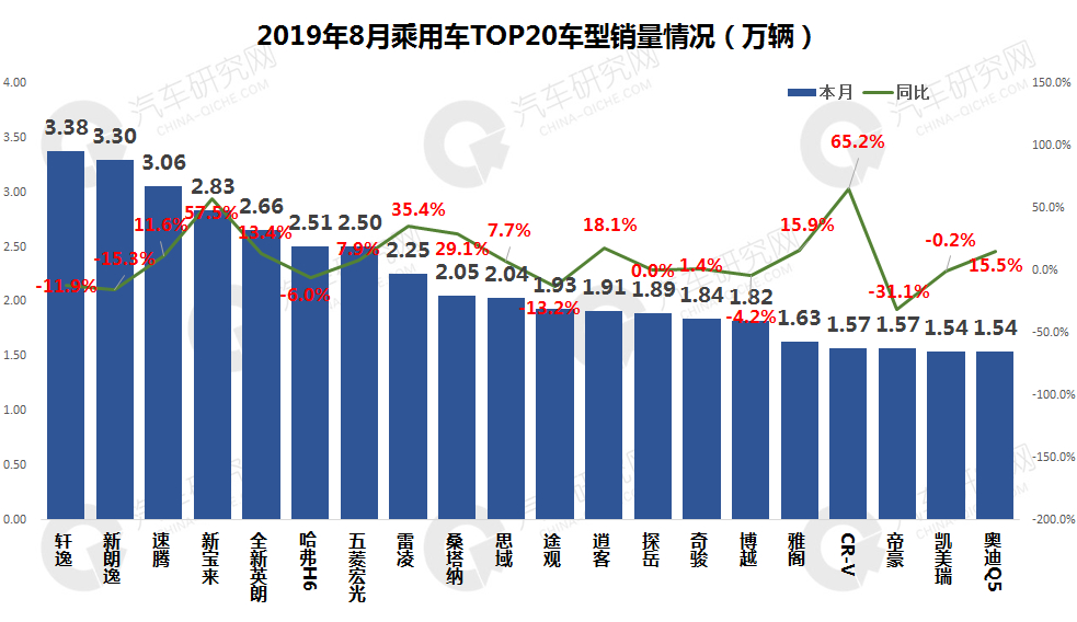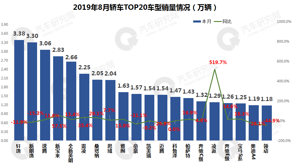 从TOP20车型来看,日系轩逸成功登顶,德系的新朗逸则位列第二,排名第三的是速腾车型。