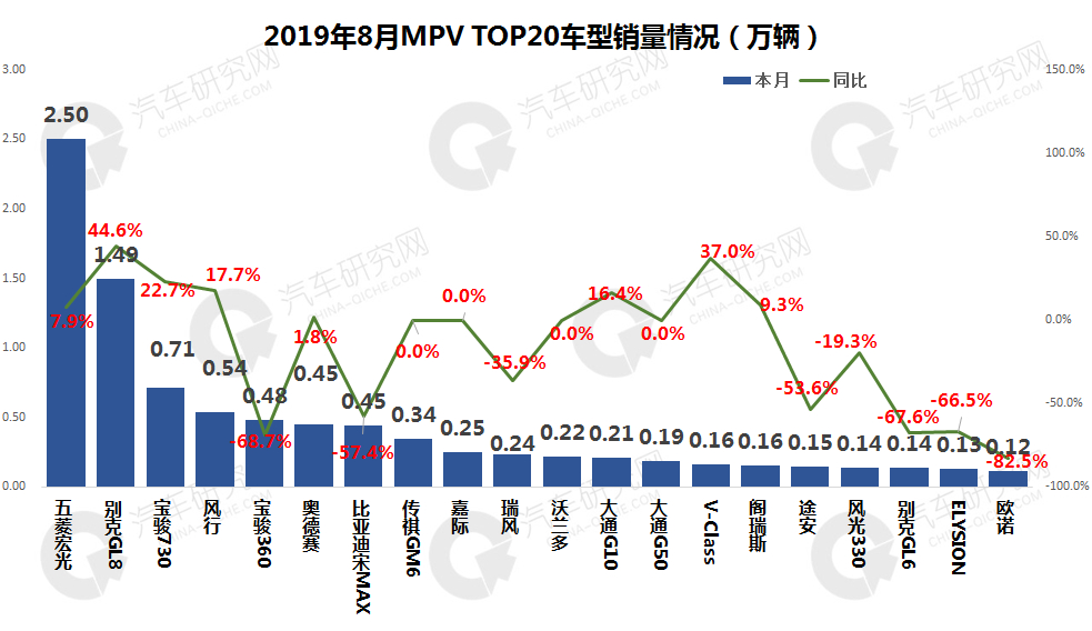 TOP20车型中,有13款国产车,合资车仅有7款;五菱宏光以2.50万辆稳居榜首,同比增长7.9%;别克GL8销售1.49万辆,位居第二位,同比增长44.6%;宝骏730销售0.71万辆排名第三,同比增长22.7%。