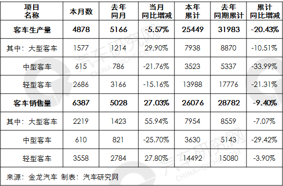 金龙汽车9月客车销售量4958辆 同比下降9.14%