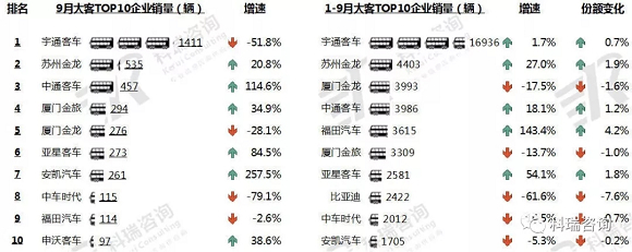 9月,TOP10大客企业销量六升四降。宇通客车稳居首位,销量超过千辆,同比大幅下滑51.8%;中通客车、亚星客车、安凯客车同比大幅增长。