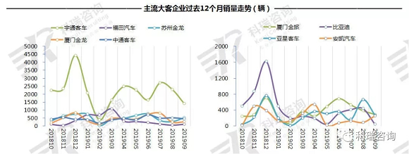 1-9月,TOP10大客企业累计销量五升五降。宇通客车居于首位,销量超过万辆;福田汽车销量增幅最大,达到143.3%;比亚迪下滑严重,超过50%。