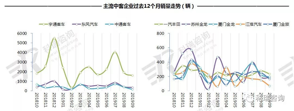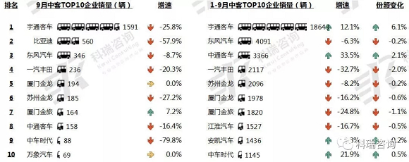 9月,TOP10中客企业销量一升七降二平;宇通客车仍排名首位,但同比下降25.8%;仅厦门金旅实现小幅增长。