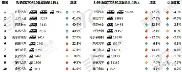 9月,TOP10轻客企业销量五升四降一平。江铃汽车销售近8千辆,同比增长11.3;上汽大通、保定长安、东风汽车增幅较大,均超40%;金杯汽车降幅最大,达到41.9%。