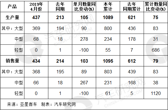 4月,亚星客车销量为434辆,同比增长103%;1-4月,亚星客车销量为1095辆,同比增长79%。 [详细]