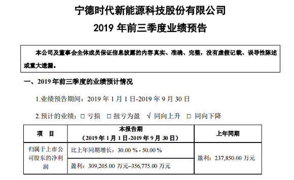 10月14日晚,宁德时代新能源科技股份有限公司(以下简称:宁德时代)发布了2019年前三季度业绩预告。预告显示,截止到9月30日,宁德时代预计今年前三季度归属于上市公司股东的净利润为30.92亿-35.68亿元,相比去年同期的23.79亿元增长了30%-50%。