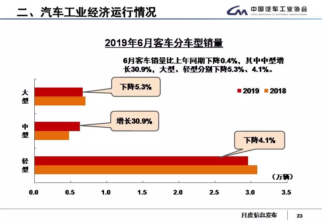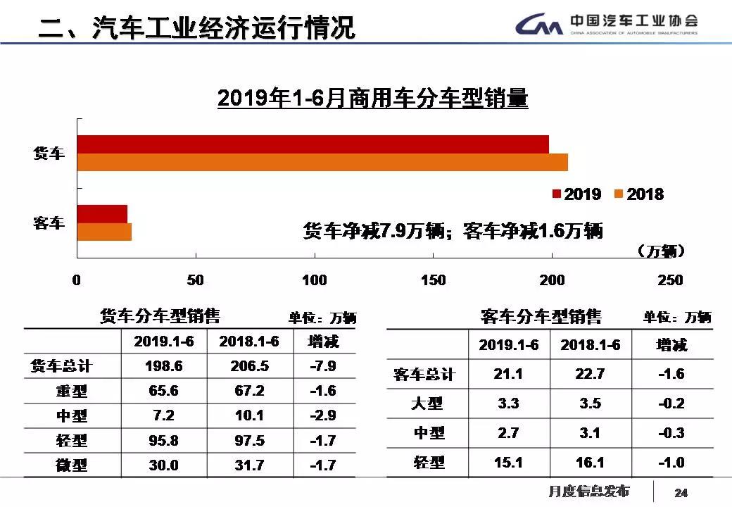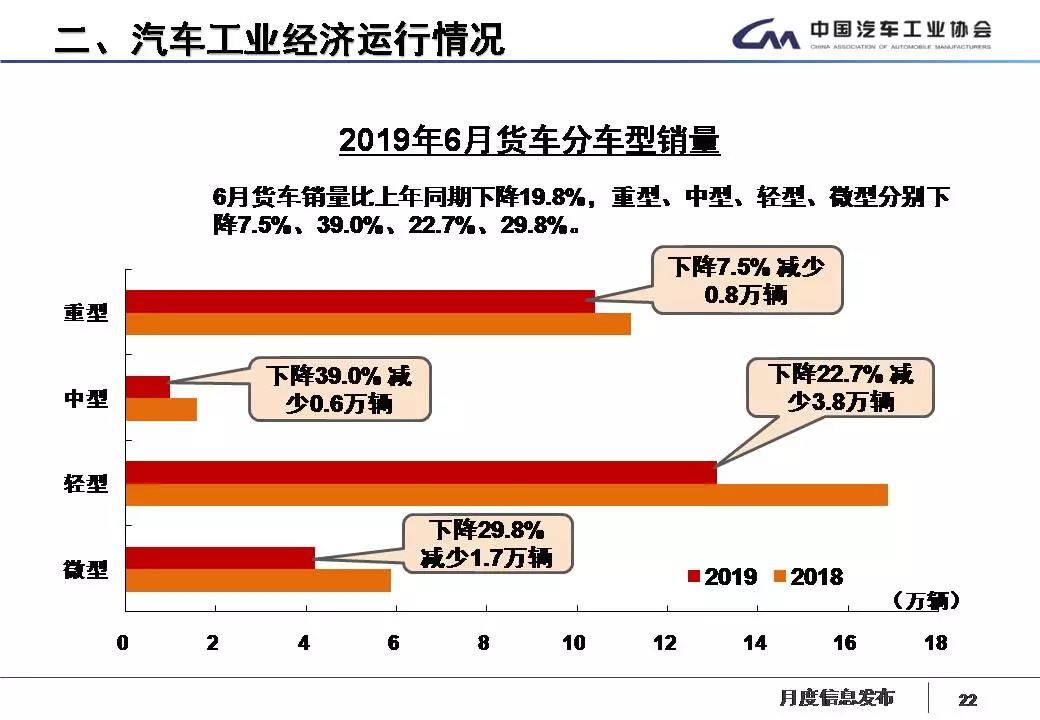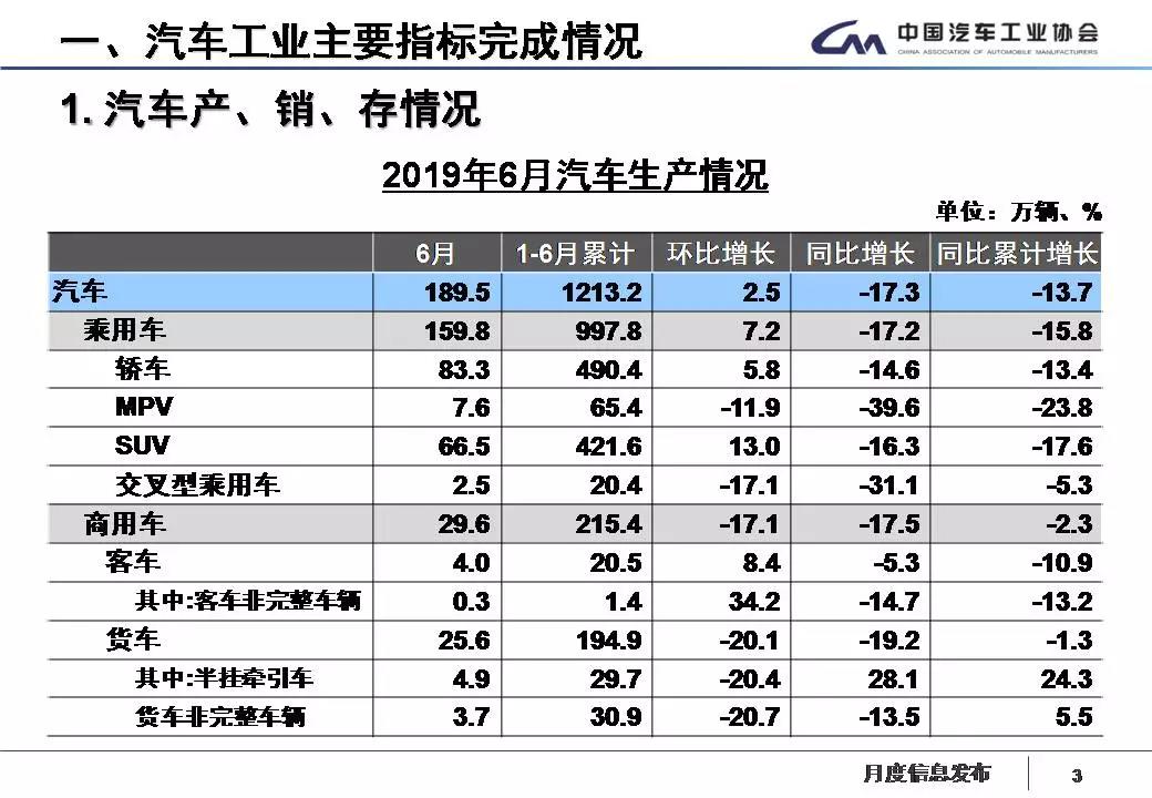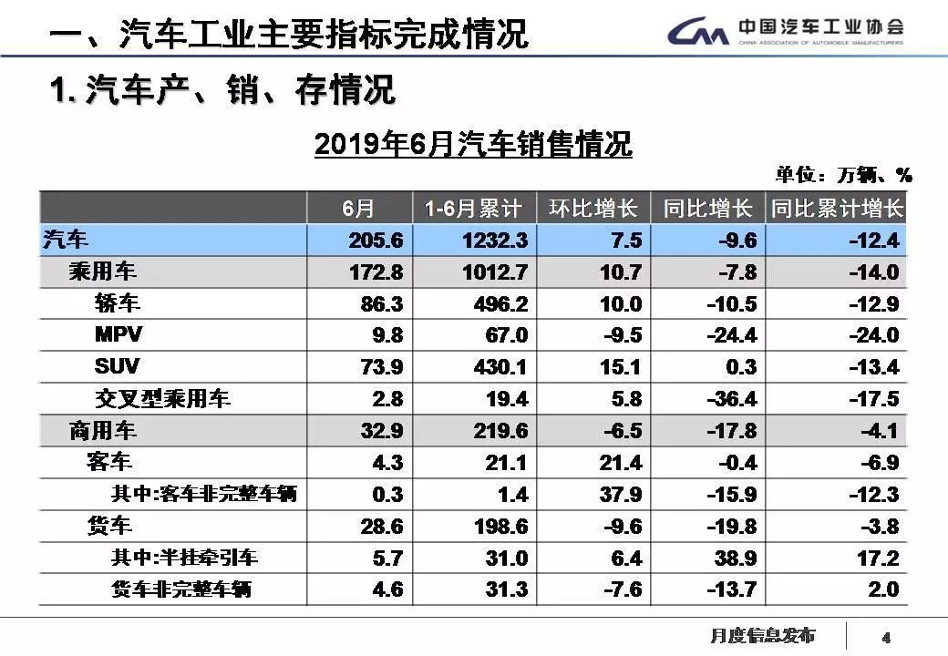 据中国汽车工业协会统计分析,从2019年6月产销数据完成情况看,虽然行业整体降幅有所收窄,但是行业产销整体下降依然面临较大压力,产销已连续12个月呈现同比下降。受7月1日部分地区切换国六标准,以及新能源汽车补贴退坡过渡期于6月25日结束,在厂家和经销商促销政策的共同促进下,乘用车市场需求比上月有所回升,本月汽车产销率108.5%。企业去库存力度加大,企业端库存降至2014年7月以来的最低点;受国家治理“大吨小标”力度加大,轻型货车产销环比和同比均呈现了10%以上的下降,从而影响到商用车产销的增速。
