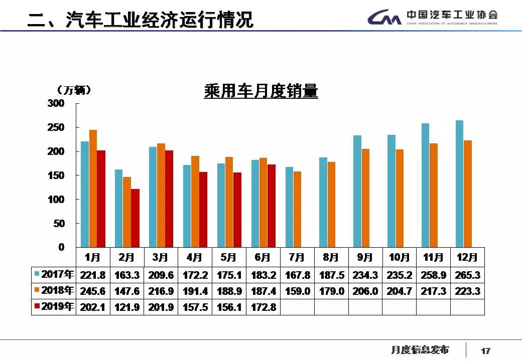 6月,乘用车产销分别完成159.8万辆和172.8万辆,比上月分别增长7.2%和10.7%,比上年同期分别下降17.2%和7.8%,降幅略小于汽车总体。