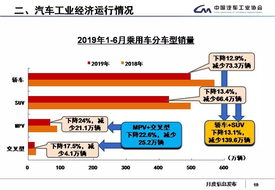 1-6月,乘用车产销分别完成997.8万辆和1012.7万辆,产销量同比分别下降15.8%和14%。销量降幅比1-5月开始收窄。乘用车四类车型产销情况看:轿车产销比上年同期分别下降13.4%和12.9%;SUV产销比上年同期分别下降17.6%和13.4%;MPV产销比上年同期分别下降23.8%和24%;交叉型乘用车产销量比上年同期分别下降5.3%和17.5%。