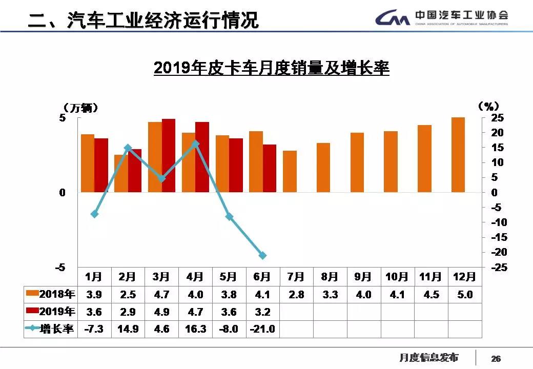 1-6月,皮卡车产销分别完成22.8万辆和22.9万辆,产销量比上年同期分别下降5%和2.8%,降幅低于货车整体增速。