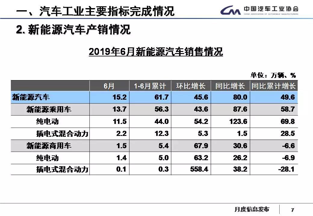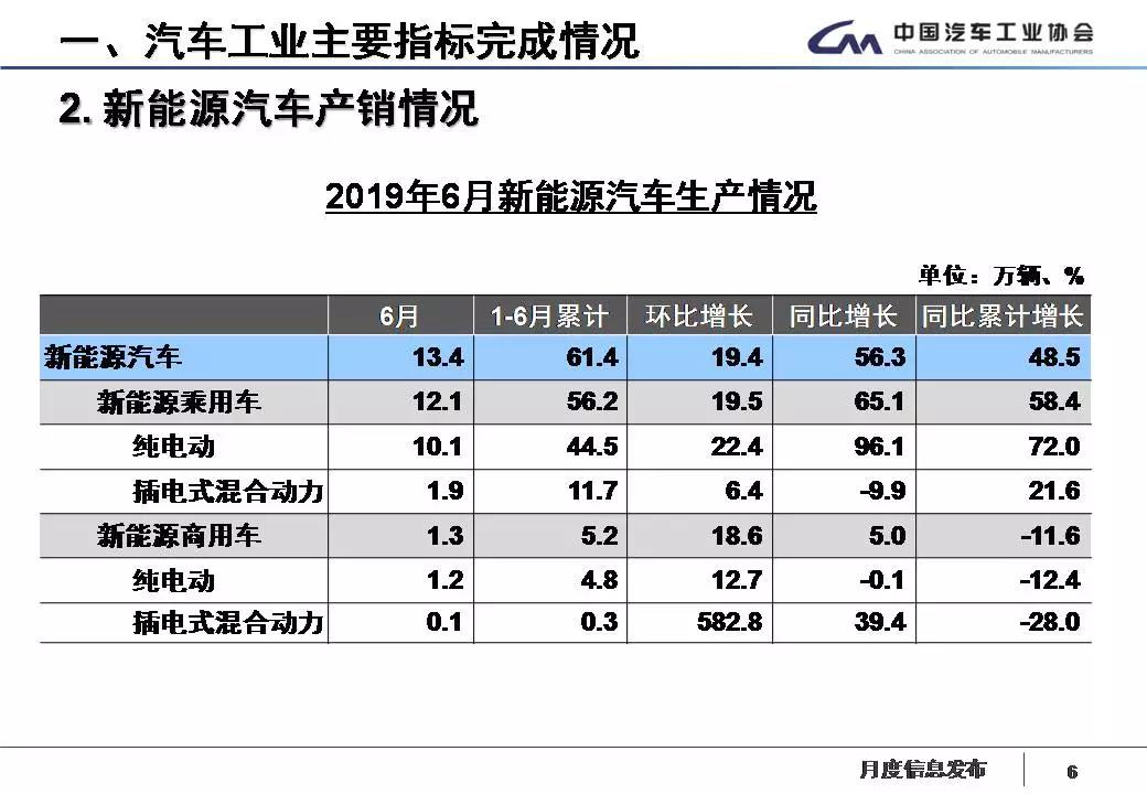 1-6月,新能源汽车产销分别完成61.4万辆和61.7万辆,比上年同期分别增长48.5%和49.6%。其中纯电动汽车产销分别完成49.3万辆和49.0万辆,比上年同期分别增长57.3%和56.6%;插电式混合动力汽车产销分别完成11.9万辆和12.6万辆,比上年同期分别增长19.7%和26.4%;燃料电池汽车产销分别完成1170辆和1102辆,比上年同期分别增长7.2倍和7.8倍。