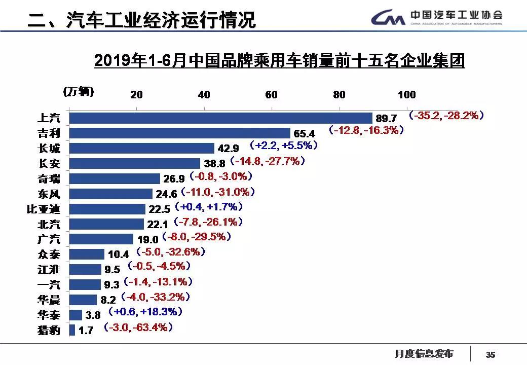 1-6月,汽车销量排名前十位的企业集团销量合计为1099.7万辆,比上年同期下降12.1%,略低于行业整体降幅。占汽车销售总量的89.2%,高于上年同期0.3个百分点。